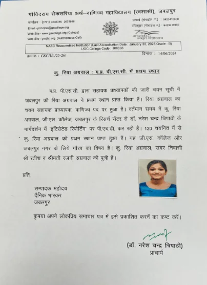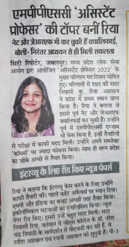 Ku. Ria Agarwal secured first position in MPPSC Assistant Professor exam